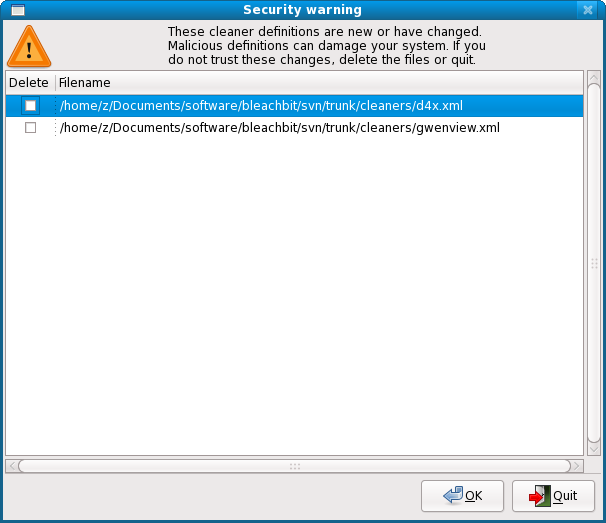 2. You shouldn't see the security warning dialog. It shouldn't show for CleanerML files in /usr/share