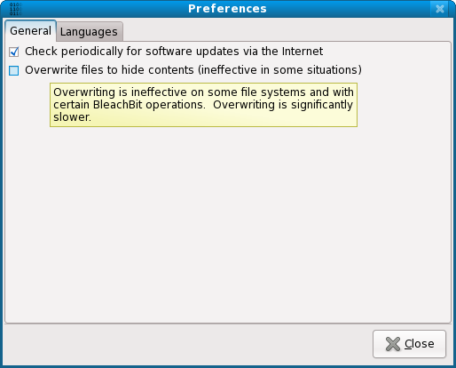 - BleachBit 0.6.1 preferences dialog showing new options to choose drives for which to overwrite free space (Ubuntu 9.04): This screenshot shows the new preferences page for selecting a path for each drive for which to shred space. A typical Linux system includes the home directory and temporary directory unless they are the same partition, in which case only one should be listed. In Windows, typically only C:\ is listed. BleachBit guesses the most appropriate settings.