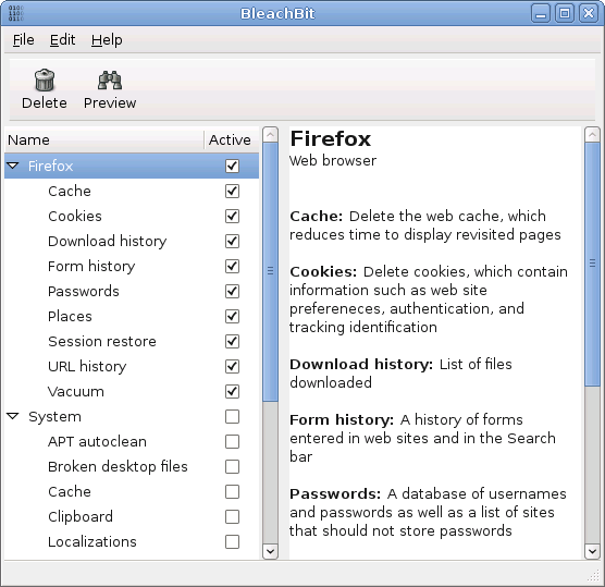 - BleachBit 0.6.0 on Ubuntu 9.04 showing the Firefox preview